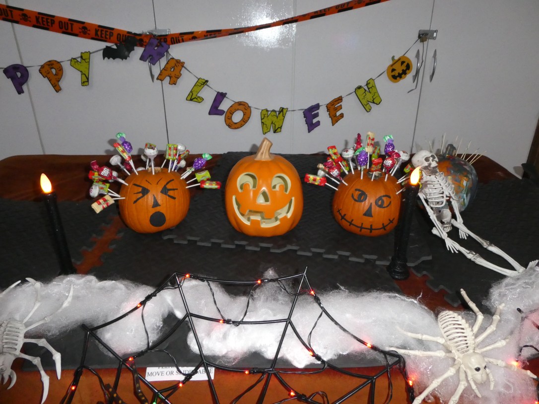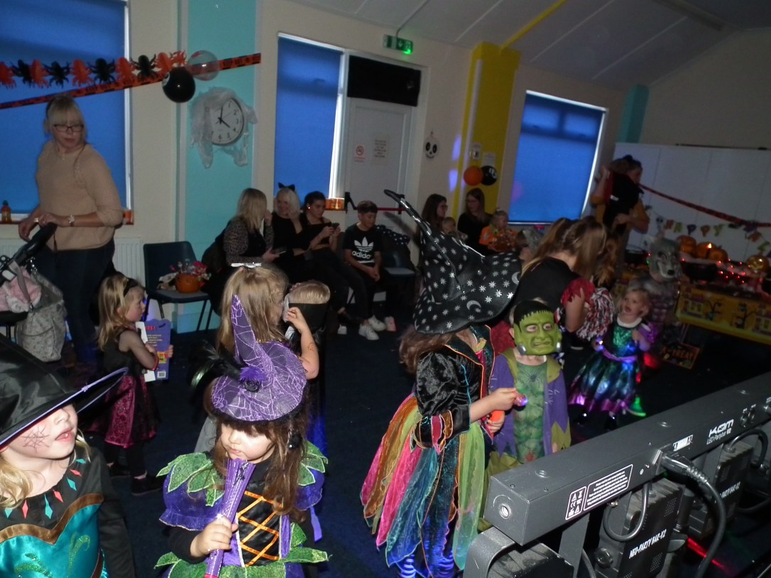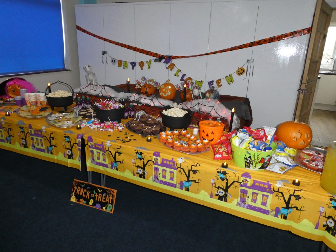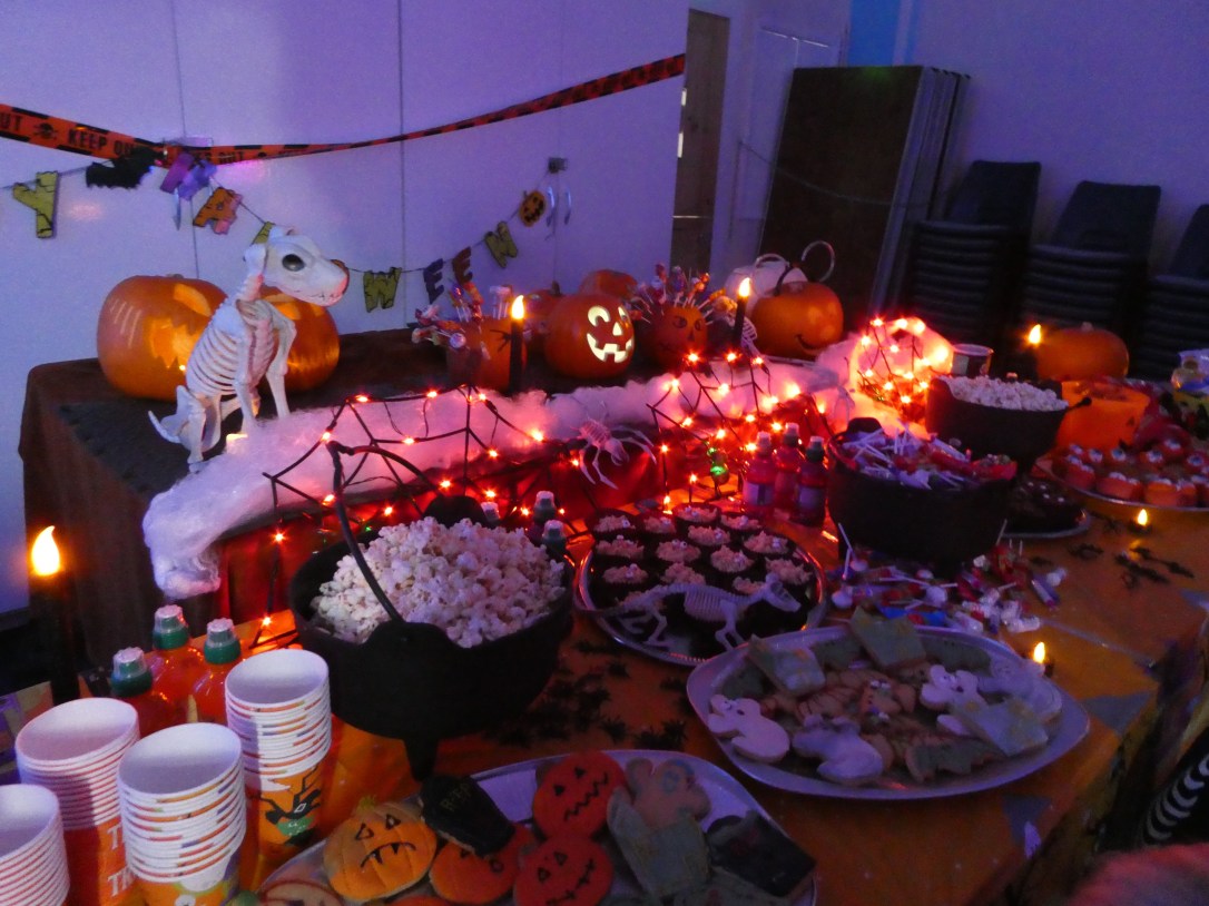 After a rather stressful time setting up the centre with balloons, banners, giant spiders, gravestones, lights and pumpkins, the scene was finally set (thank you to a couple of early arrivals who helped me calm down and get the rest of the bits up in time 😘, it would appear I’m far too particular and have too many ambitious ideas 😆). The room looked great and the costumes were on just in time for our guests to arrive.