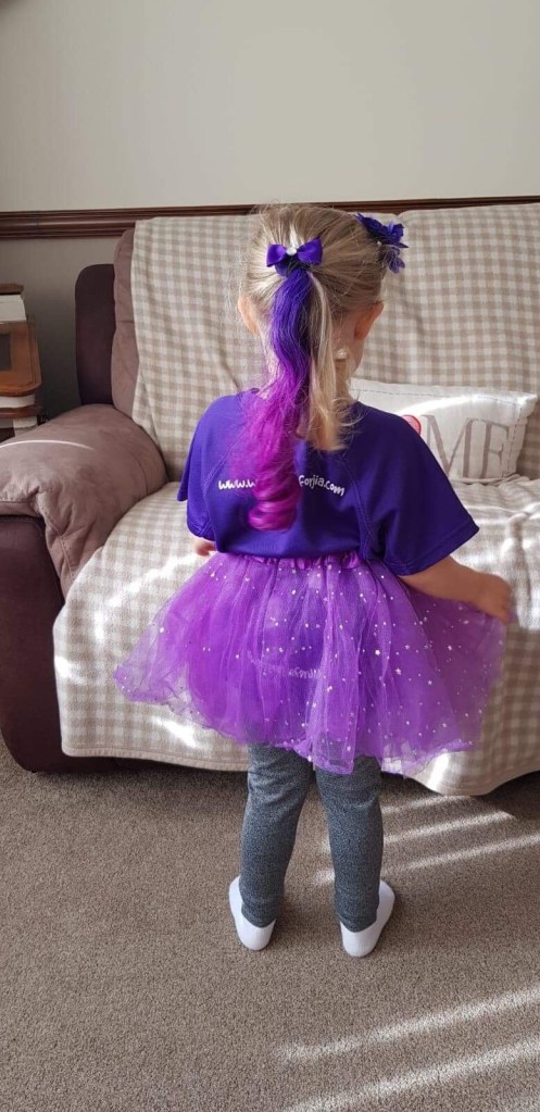 Imogen was very proud this morning, going to school nursery for her last day of term as purple as can be. Her school are celebrating the end of term by holding a wear purple day for JIA