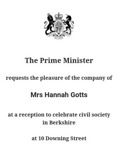 The whole thing came about a couple of weeks previous when I received an invitation via email. The first line said ‘The Prime Minister requests the pleasure of the company of Mrs Hannah Gotts at a Reception to celebrate civil society in Berkshire’. My first thought was that it was spam so I therefore laughed it off and ignored it. It wasn’t until a later date when speaking to someone at NRAS and telling then about my odd email that they confirmed it was infact a real invitation. As you can imagine I was rather shocked but absolutely delighted to think that I had been invited to such an event and retrieved the message as soon as I was able to. Luckily I had the date free and managed to arrange childcare and some reasonably priced train tickets. Hubby decided he would come along and keep me company on the train as he didn’t like the idea of me travelling back on my own late at night (I know bless him).
