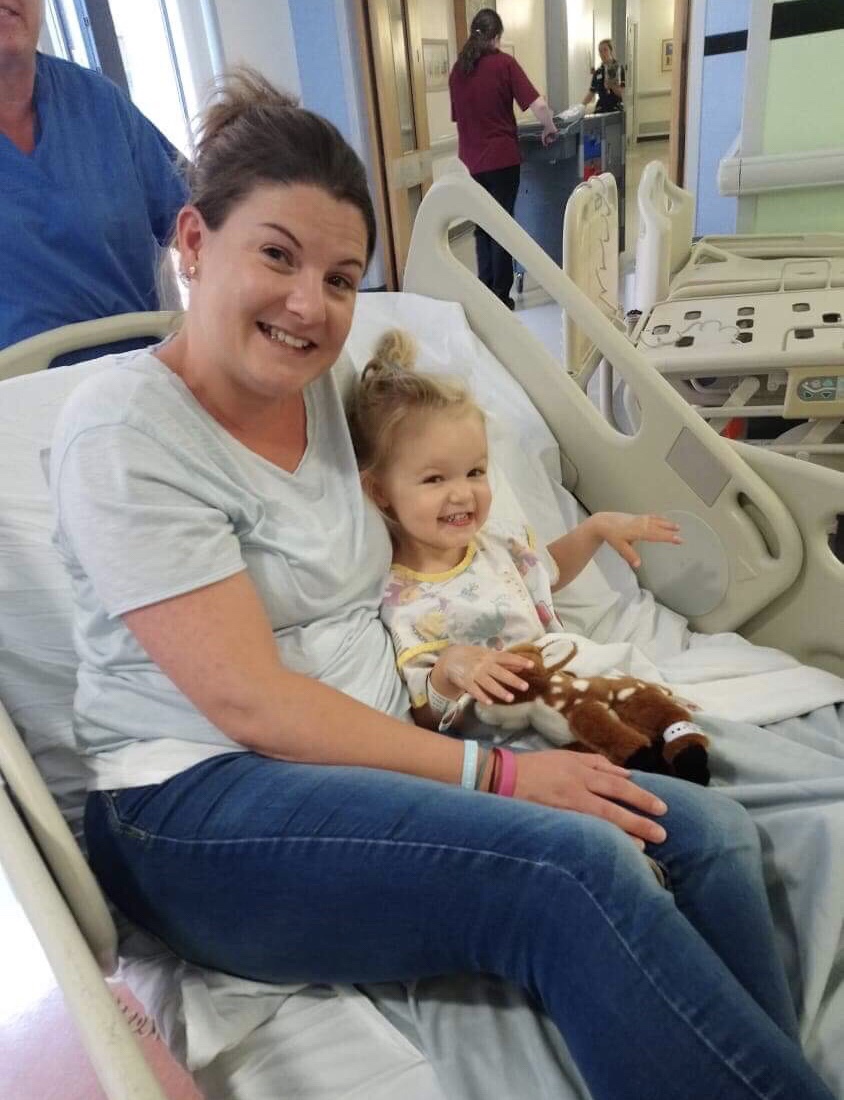 So both Imogen and her best comfort teddy Bambi were tagged up and ready to go. Lucky Mummy got to ride around the hospital on the bed with them both, whilst Daddy followed with the bags behind us. When we reached the anaesthetic room I was pleasantly surprised how easy and relaxed this part was. The last time Imogen went under anaesthetic I literally had to wrestle her very distressed body and hold the gas mask over her face until she went floppy, it was torturous. This time it was a totally different experience, the anaesthetist was fantastic he sat Imogen on my lap and she watched pepper pig on a little tablet whilst he stood behind gently cupping his hands and the tube under her chin so she wasn’t really aware that she was slowly breathing the gas in, and his hands slowly closed tighter. He did warn us that she might kick out a little as the gas starts to take over, which she did but it was very was calm and peaceful and she looked up at me for reassurance as she went to sleep. I just carried her to the table and then we were given our buzzer which would go off once she was back in recovery.