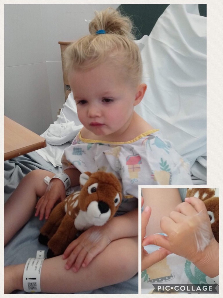 I think it’s a fear that has stemmed from her first ever blood test and it will be there I’m sure for a long time to come. Poor little luv had the cream on both hands and it was all going really well until those big sticky pads went over the top, then that was it Imogen disappeared. I literally had to sit on her hospital bed with her and cover her hands with mine so she couldn’t see them, and that’s how we remained until they fetched us for theatre. The only time she moved was to go to the toilet but she held her hands out as if she couldn’t move her arms, bless her little heart.